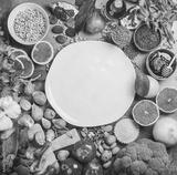 Clean eating concept over grey background with white plate in center, top view, copy space. Vegetables, fruit, seeds, cereals, beans, spices, superfoods, herbs for vegan, raw diet and gluten free diet
