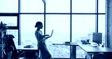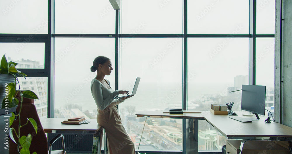 A young professional woman working on a laptop in a modern office with large windows and a scenic view, embodying focus, productivity, and a contemporary workspace atmosphere