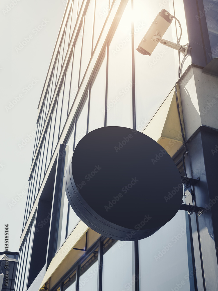 Signboard shop Mock up Black signage display with cctv Building Exterior