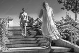 Summer in city. Two beautiful middle aged women on concrete stairs: one walking up, other walking down stairs in city on sunny day