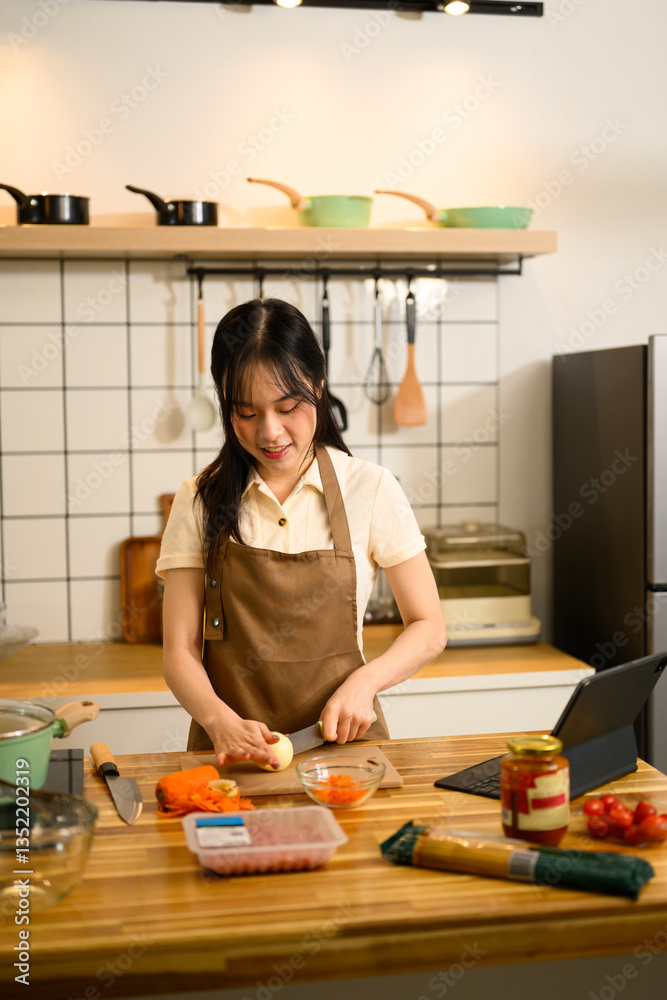Woman preparing fresh ingredients for a homemade spaghetti dish in a kitchen