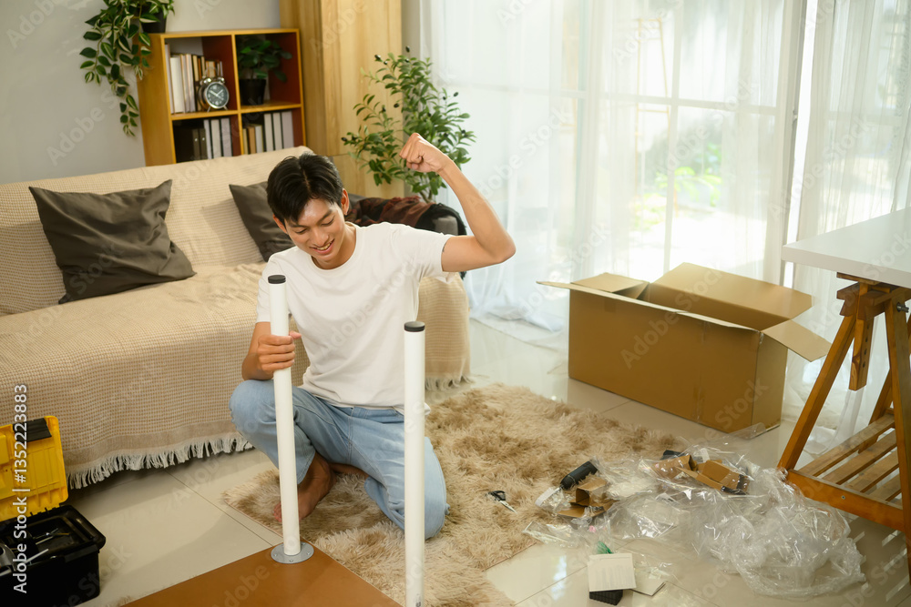 Happy man raising fist in triumph, celebrating his successfully assembling table
