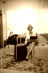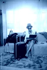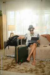 Traveler getting ready for vacation, using digital tablet to checking maps or confirming accommodations
