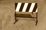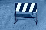 A bright red and white striped construction barrier stands on a gravel surface, indicating restricted access at an active roadwork site under clear skies