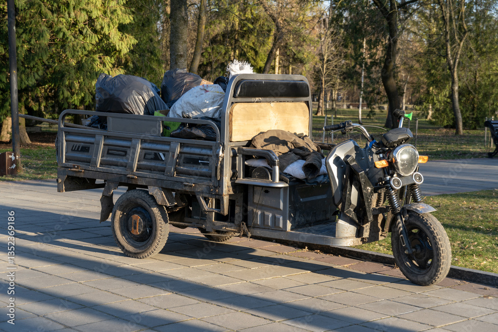 A motorcycle with a cargo bed is parked along a paved path in a park, surrounded by lush trees. The vehicle carries bags and materials, showcasing urban utility