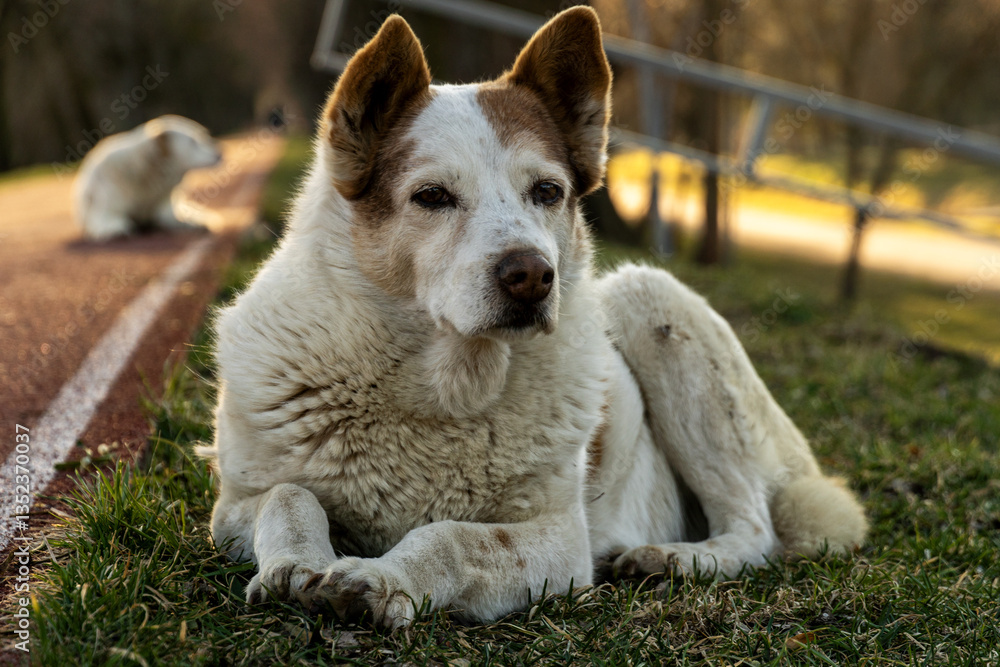 A dog rests calmly on the grass next to a running path, enjoying the peaceful atmosphere as the sun sets, casting warm light across the park