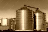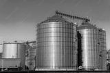Large metallic grain silos stand tall against a bright blue sky in a productive agricultural setting, symbolizing the importance of grain storage