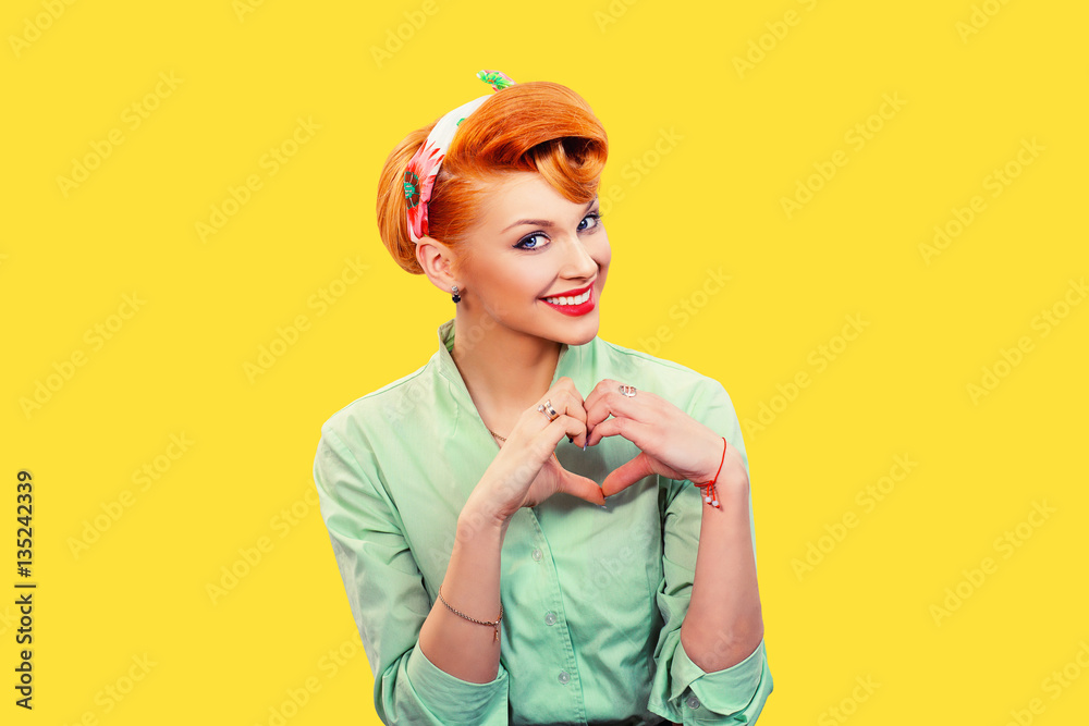Closeup portrait smiling cheerful happy young woman making heart sign with hands isolated on grey wall background. Positive human emotion expression feeling life perception attitude body language