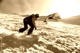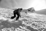 Young woman in teal jacket and white helmet snowboards down a steep mountain