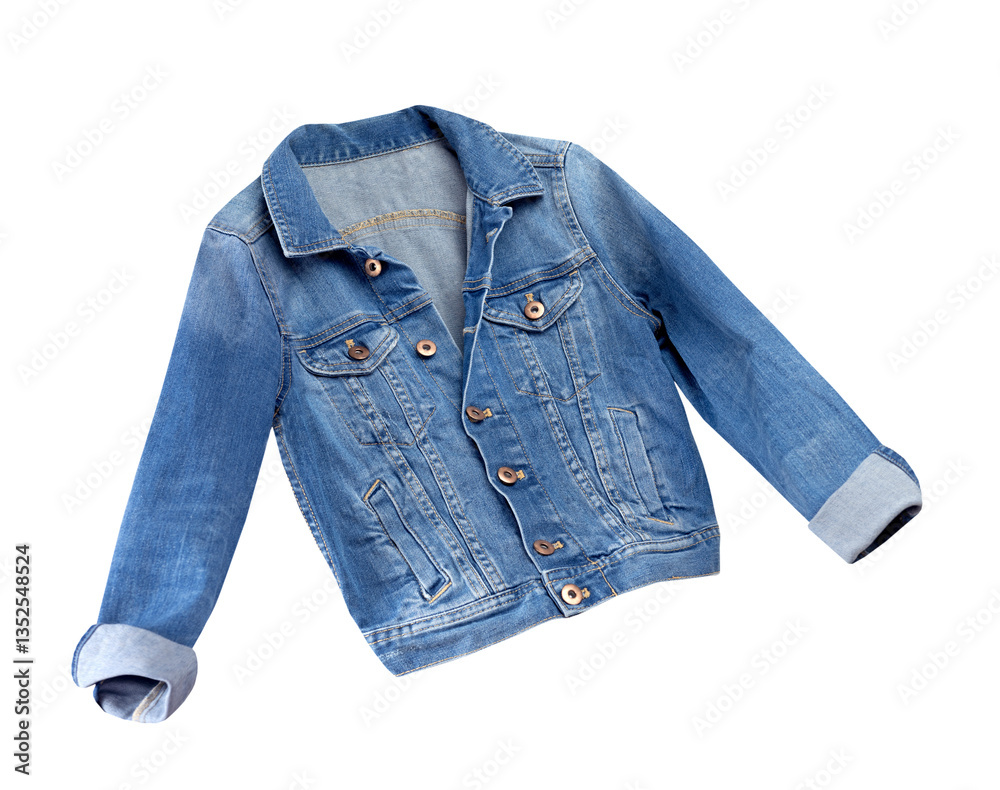 Blue denim jacket isolated on white, jean flying dungaree.Female crumpled coat.
