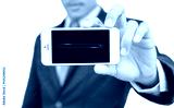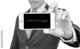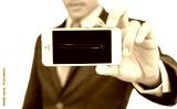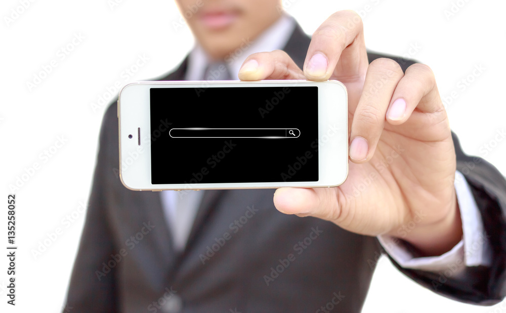 businessman offering the smartphone search here on white backgro