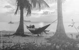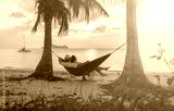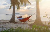Couple looking on the sea in hammock on a sand beach at sunset of Thailand