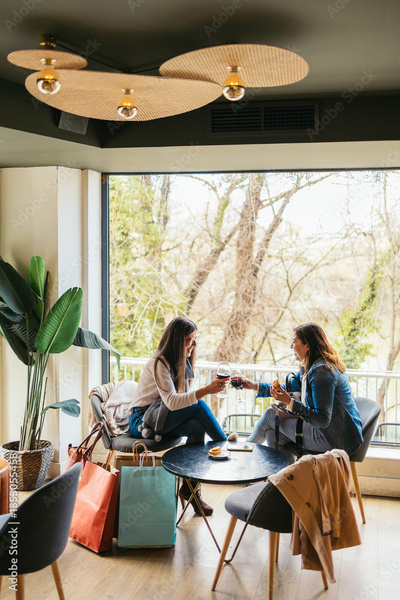 Mature women sharing wine, relaxing after successful shopping trip, celebrating friendship at cozy cafe table