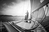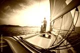 Couple enjoying sunset from the deck of the sailing boat moving in a sea