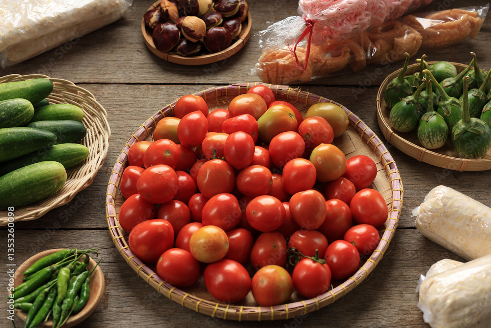 Fresh Red Small Tomato on Woven Bamboo Tray Above Wooden Table