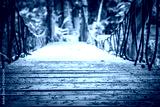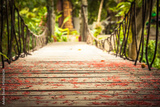 Wooden bridge leading into tropical forest with light at the end of way and blurred background