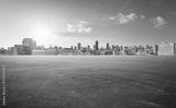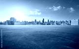 Panoramic empty wide asphalt road and modern city skyline under the sunlight.