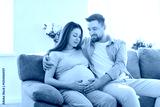 Loving couple young future parents expecting first baby sofa sitting close at home, caring husband and pregnant wife, expressing love, caress, parenthood, new life, planning, dreaming, prenatal care
