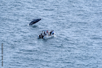 baby humpback whale breaching near a boat in pacific ocean off the coast of san jose del cabo baja california sur