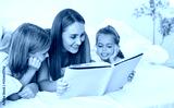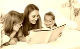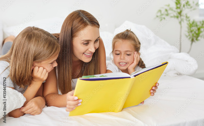 Family reading. Mother captivates her children with fairy tales as they lay comfortably on soft bed. Kids are engrossed, peering at colorful illustrations in picture book as their mother reads aloud.