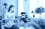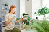 Smiling redhead woman spraying water on potted house plant flower at table. Cheerful girl taking care of monstera houseplant, watering it with spray bottle, enjoying gardening at home. Hobby concept.