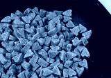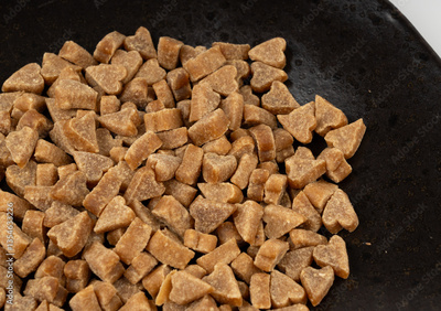 Mini pet food shaped like hearts in bowl close up, small dogs crunchy treats pile macro