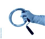 Metal drain auger tool isolated, plumbing snake or cable in hands in blue glove on white background