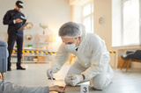 Forensic specialist in protective gear conducting detailed investigation of dead body, analyzing evidence at crime scene. Police officer in background documenting case while investigation underway.