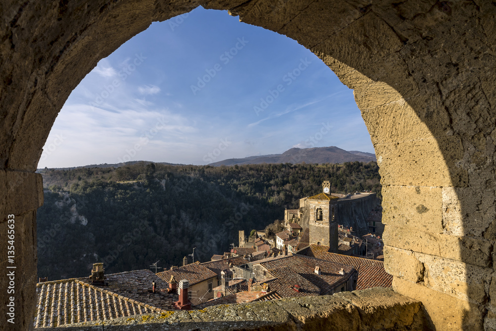 Beautiful aerial view of the historic center of Sorano, one of the tuff towns of the Maremma, Grosseto, Tuscany, Italy, framed in an arch
