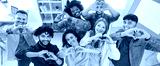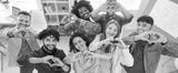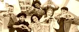 Team of happy smiling young diverse casual people business company coworkers together in office workplace looking up at camera, making hand hearts, showing love to customers. Banner, high angle, above
