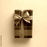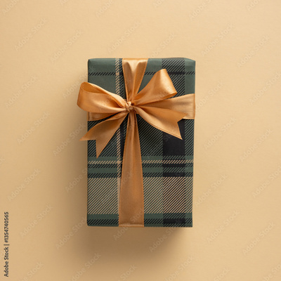 A square beautifully wrapped plaid gift box tied with a gold ribbon on a beige background