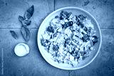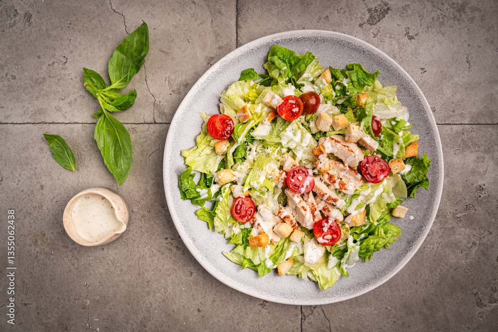Fresh caesar salad with chicken breast, croutons, lettuce, parmesan cheese, sauce and tomatoes on gray background, top view. High quality photo