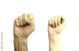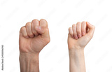 Clenched fist raised in victory, symbolizing strength and power. Male and female adults showing a