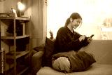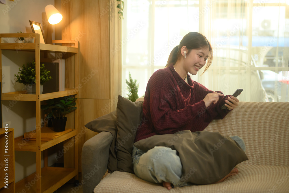 Cheerful woman listening to music through wireless earbuds and using mobile phone