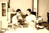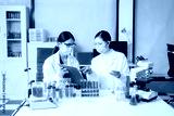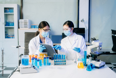 Young scientists conducting research investigations in a medical laboratory, a researcher in the foreground