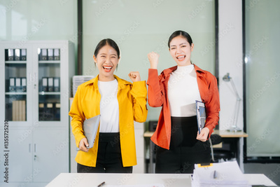 Young Asian business team creative businesspeople coworker, teamwork celebrating achievement