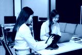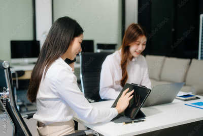 Asian business colleague business presents and explains and using laptop and tablet. Teamwork, financial marketing team,