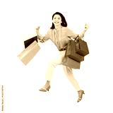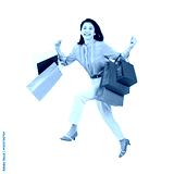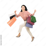 ショッピングバッグを持ってジャンプするミドル女性 手作業で精密に切り抜いた背景透過全身写真PNG