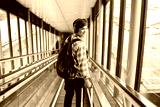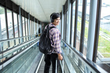 Portrait Of Young Asian Man With Luggage Down The Escalator In Airport.
