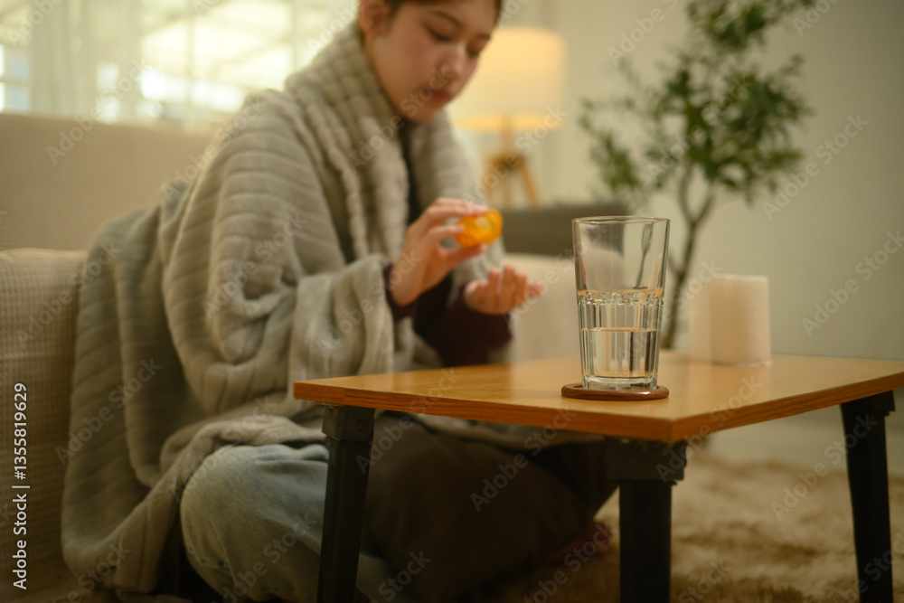 A glass of water on a wooden table with sick woman taking pill in background
