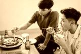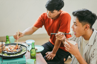 Male Friends Enjoy Eating BBQ Together at The Restaurant