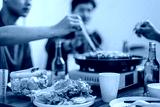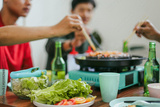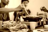 Group of Male Friends Enjoy Dinner Lunch Together with Korean Food Barbecue Grill and Alcoholic Drink