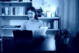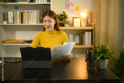 Young female graphic designer working on digital tablet and reviewing color samples at desk
