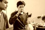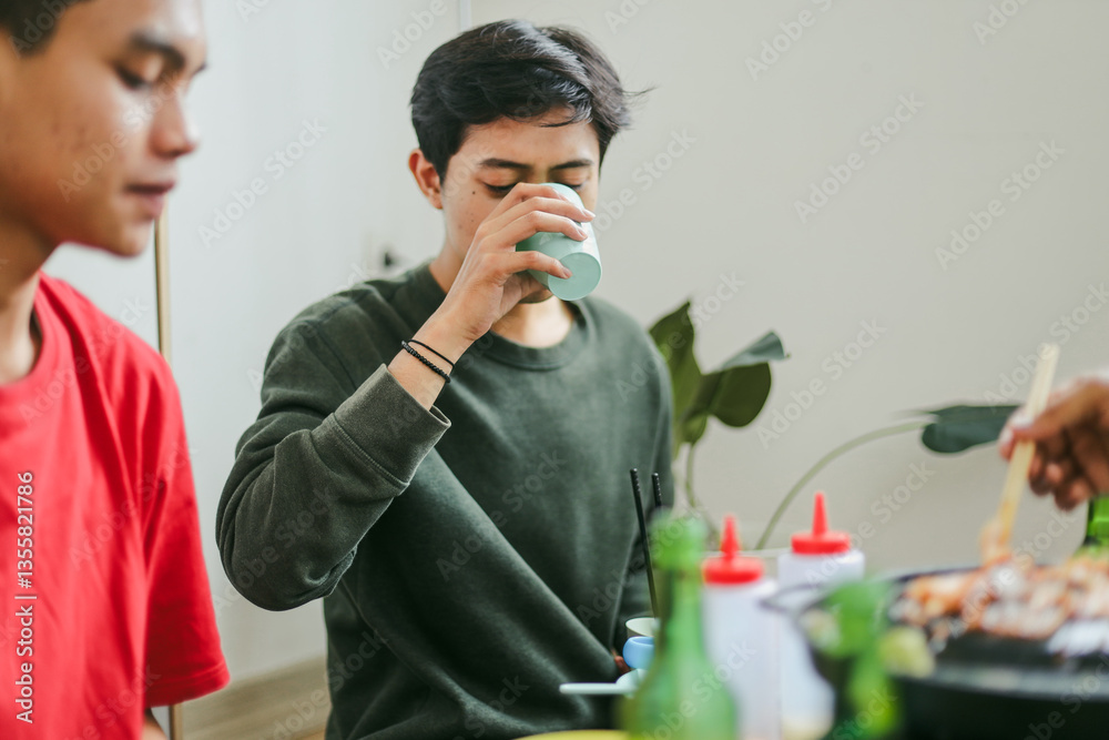Young Man Drink a Water While Eating BBQ Together with Group of Friends
