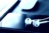 Close-up headphone stack on phone, accessories