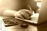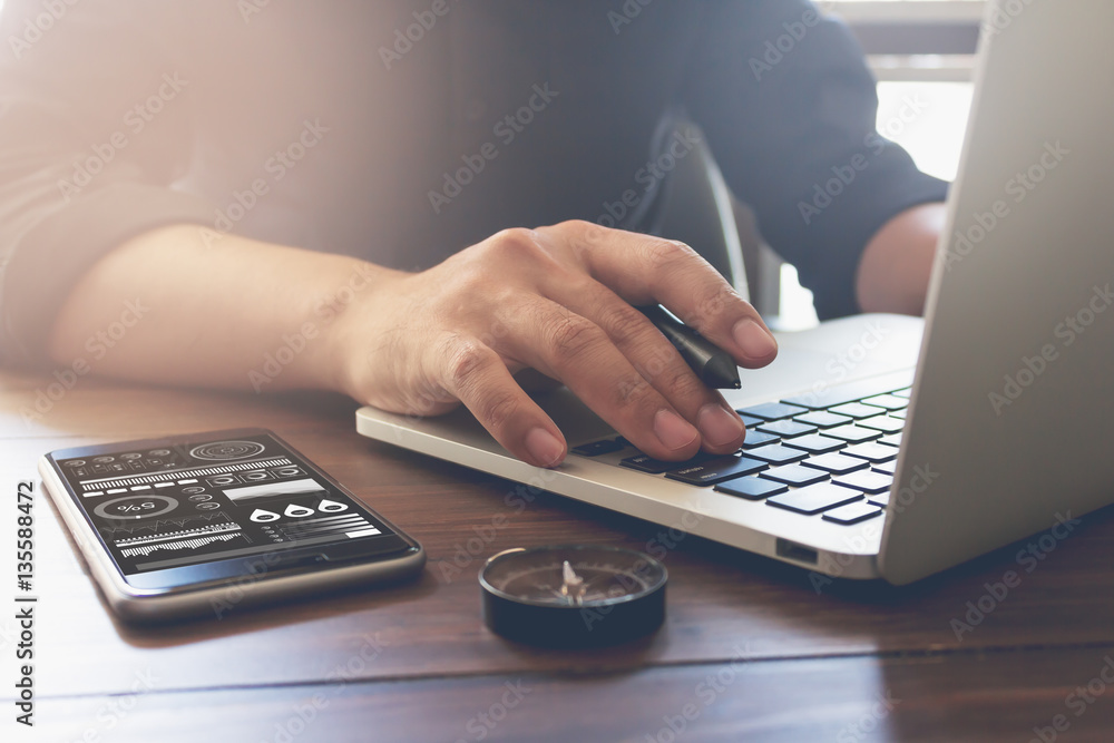 businessman hand working laptop on wooden desk in office in morning light. vintage effect