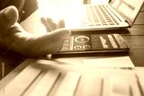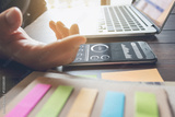 businessman hand working laptop on wooden desk in office in morning light. vintage effect