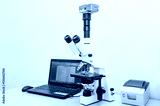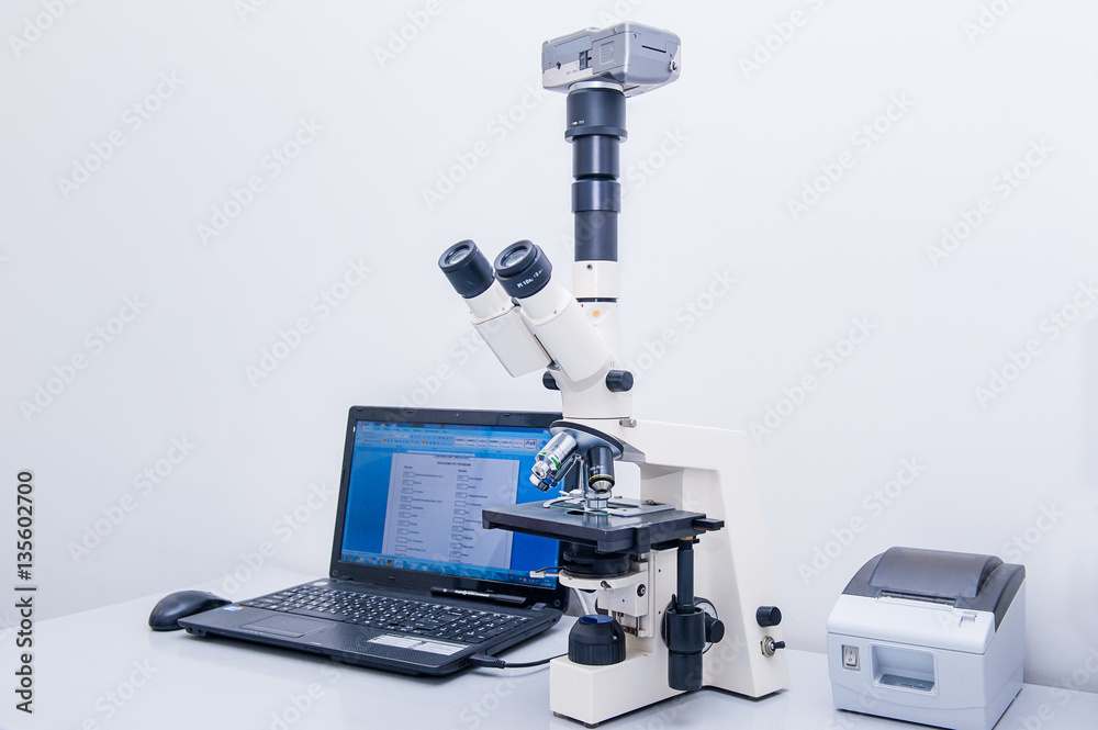 Modern microscope equipped with digital camera and computer in clinic laboratory. Selective focus