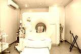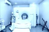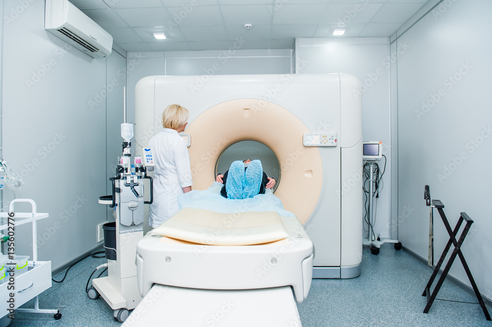 Female doctor adjusts computed tomography or computed axial tomography scan machine with lying patient in hospital room
