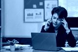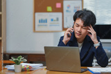 Young businessman feeling stressed while talking on the phone at his desk. Surrounded by paperwork and charts, he struggles to manage his workload efficiently